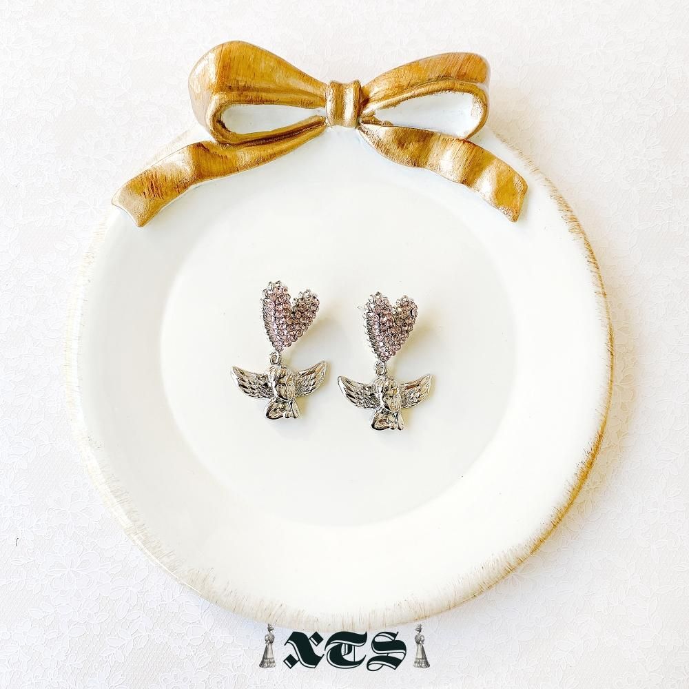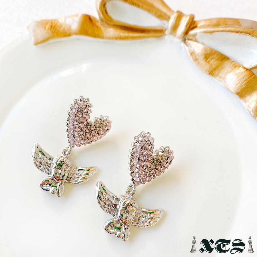 ラインストーンたっぷりなハートにエンジェルモチーフのレトロなピアス。