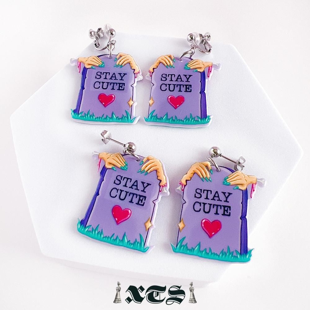 "STAY CUTE"ロゴとハート、ゾンビハンドが描かれたお墓モチーフのキュートなカラーデザイン。