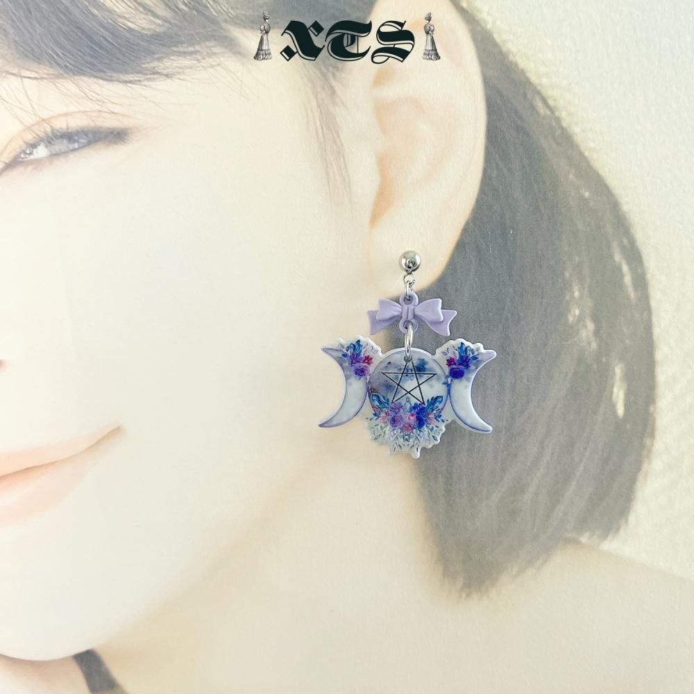 パープルとブルーの幻想的なお花が描かれたトリプルムーンモチーフ。