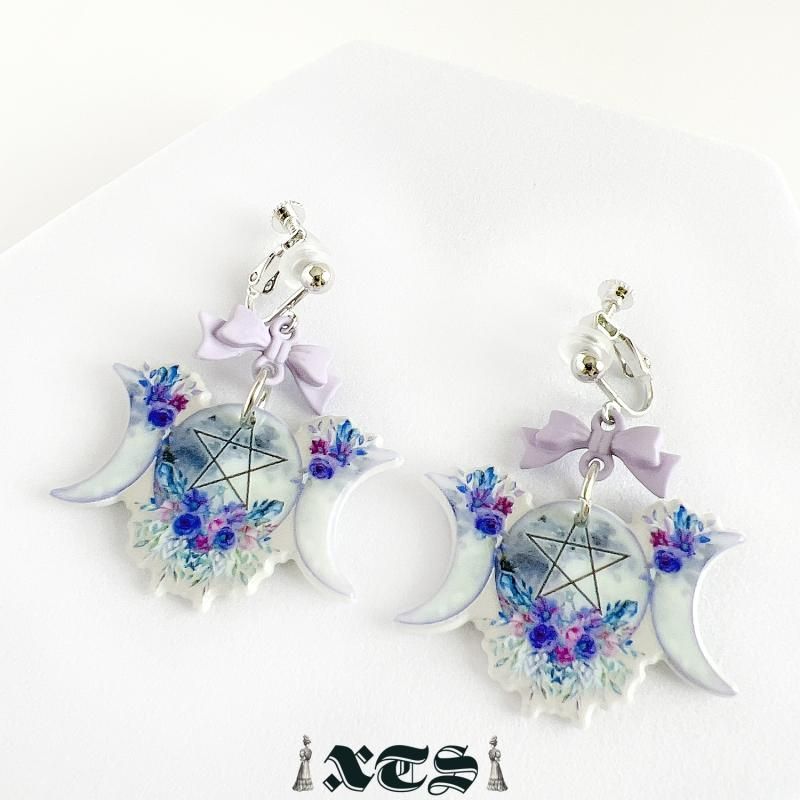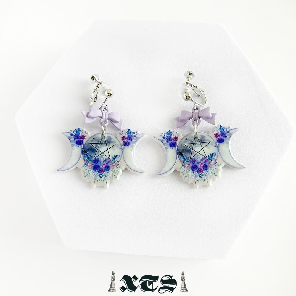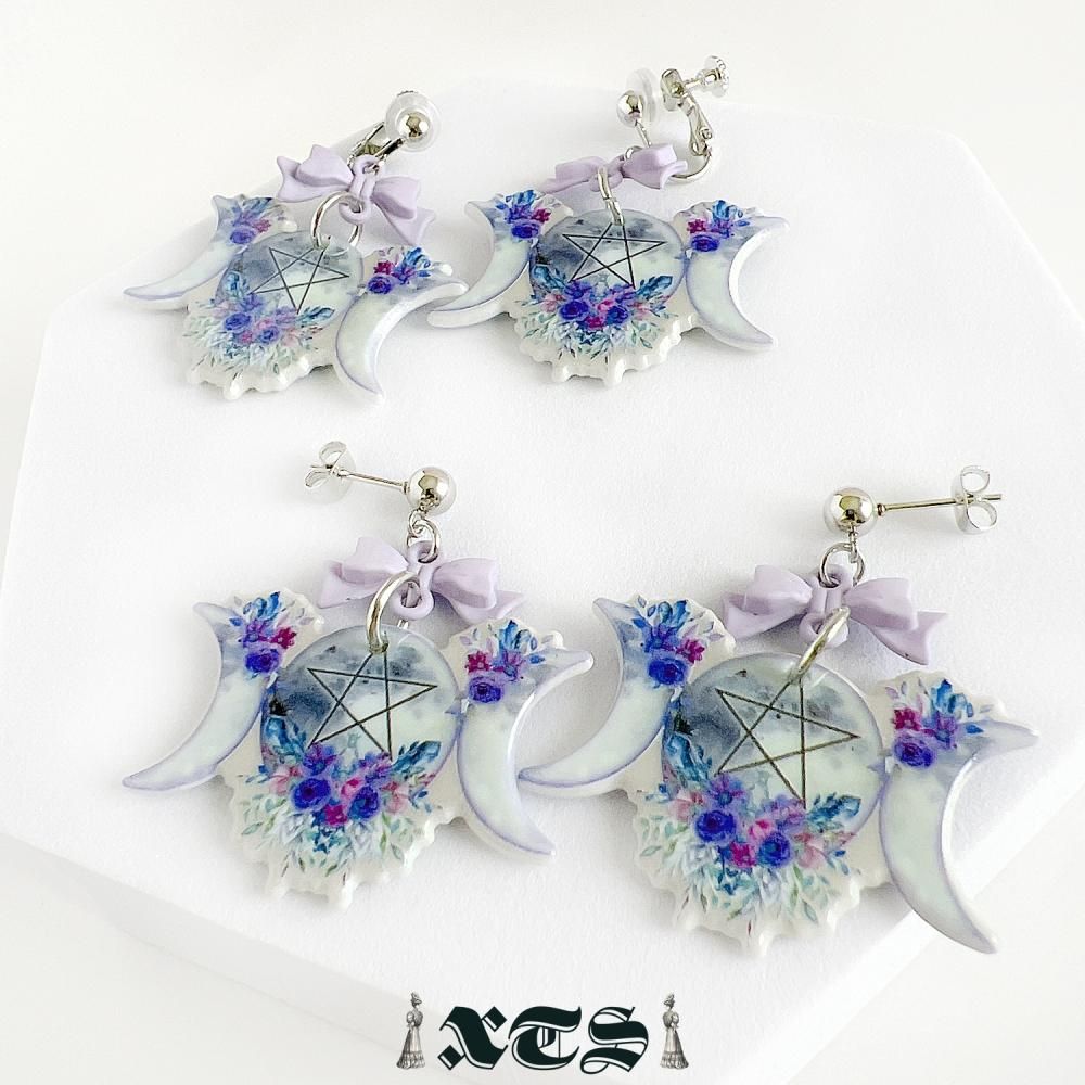 パープルとブルーの幻想的なお花が描かれたトリプルムーンモチーフ。