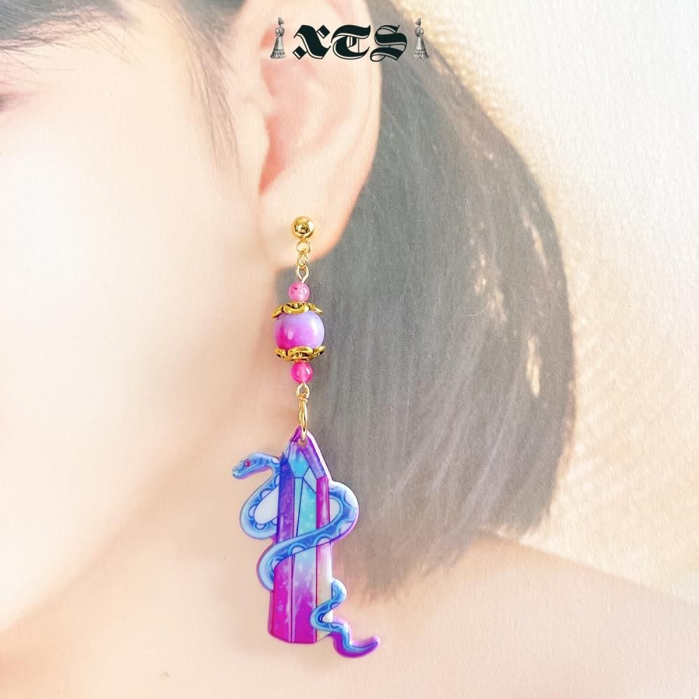パープルピンクのカラーが目を引く、水晶と蛇のデザイン。