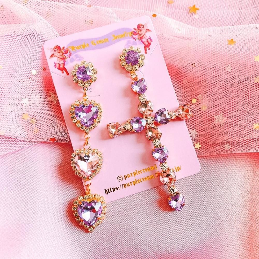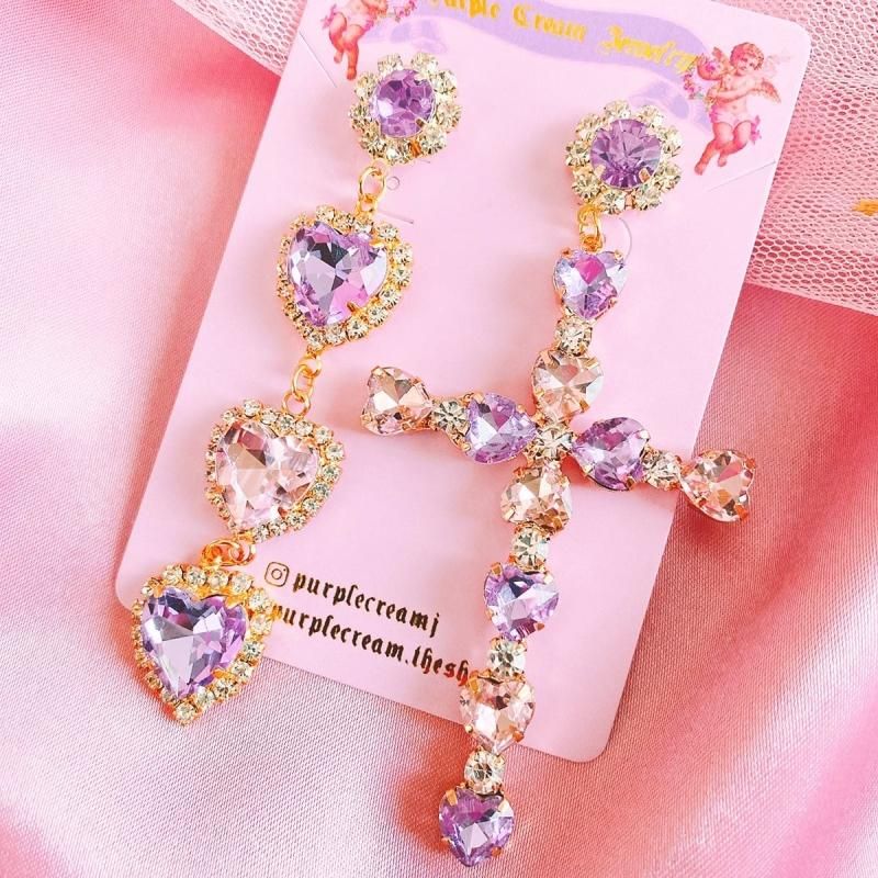 パープルとピンクのハートビジューでできたクロスと片方はハートビジュー3つが連なったキュートなピアス♪
