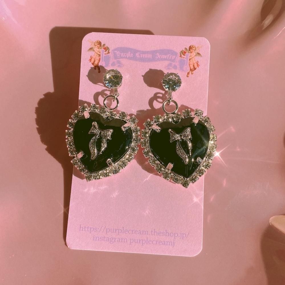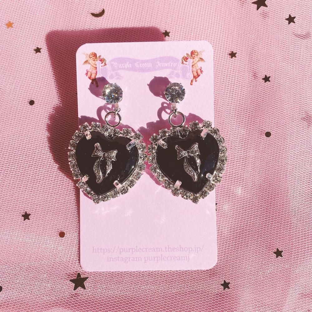 大きなブラックハートビジューにリボンモチーフがついたピアス♪