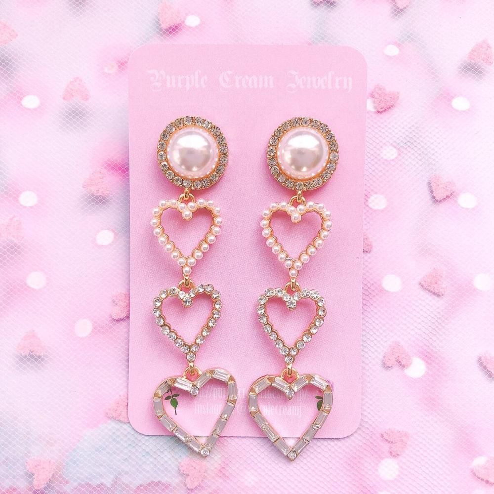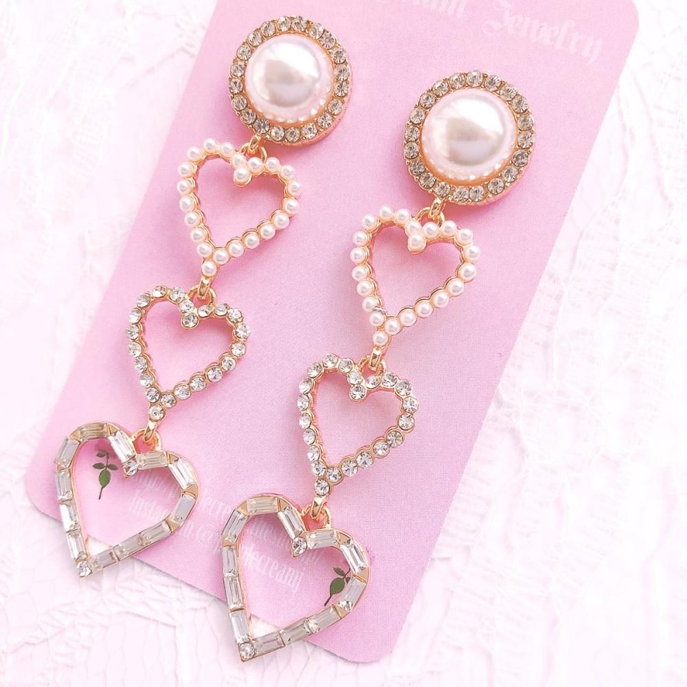 ラインストーンでキラキラのパール&ハートロングピアス♡