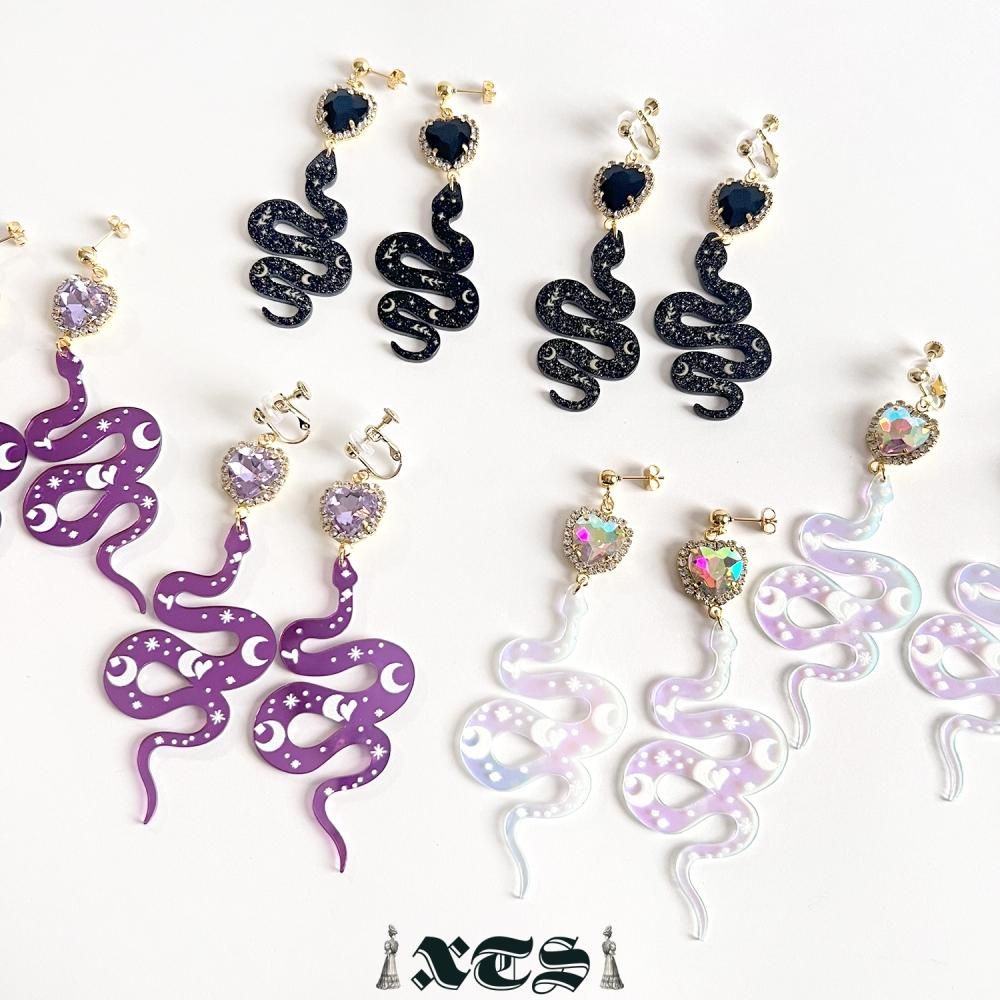 クリアホログラムカラーの蛇モチーフとハートビジューのクールなデザインアクセサリー。