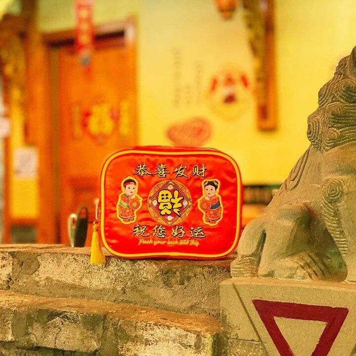 中国の街の到るところで目にする「窗花」に、春節の際に家々に貼られる「福」の字を書いた赤色の紙「倒福」、そしてこれを挟むようにして、チャイナキッズが立っている非常に縁起の良いデザインをアップリケ刺繍にて表現したスクエアポーチです。