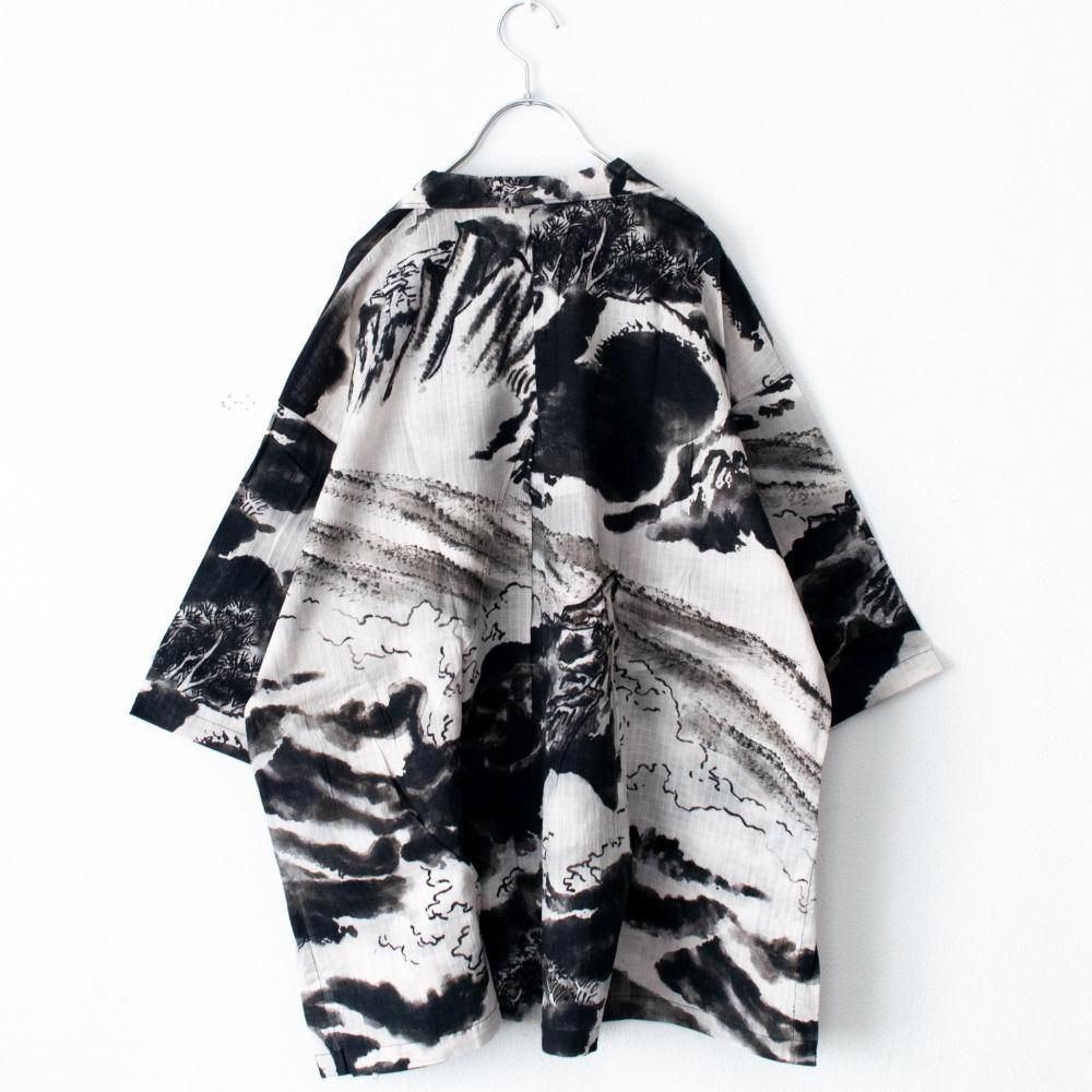 浴衣のようなさらりとした綿素材で、涼しげに着られる一枚です。風をおこし波に乗る、変化を愉しむいなせなデザインです。