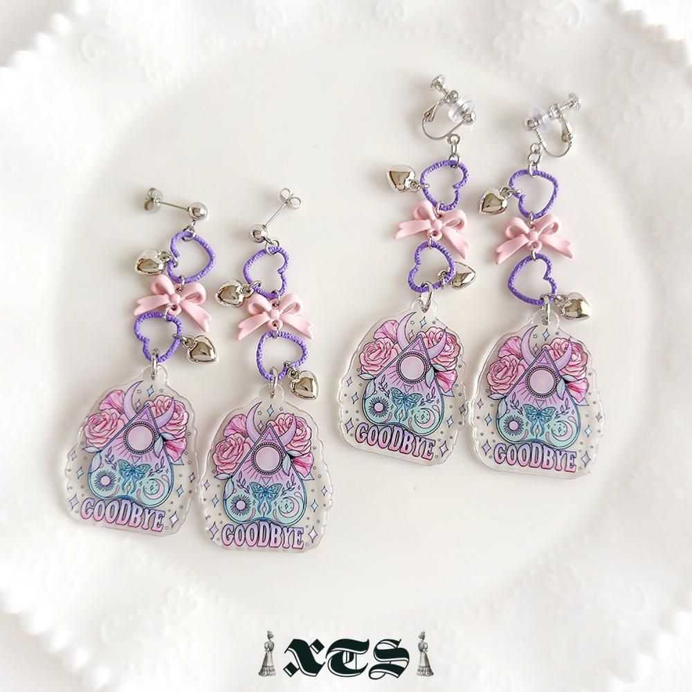 パステルピンクリボンとウィジャボードのプランシェットモチーフが組み合わされたキュートなデザインアクセサリー。