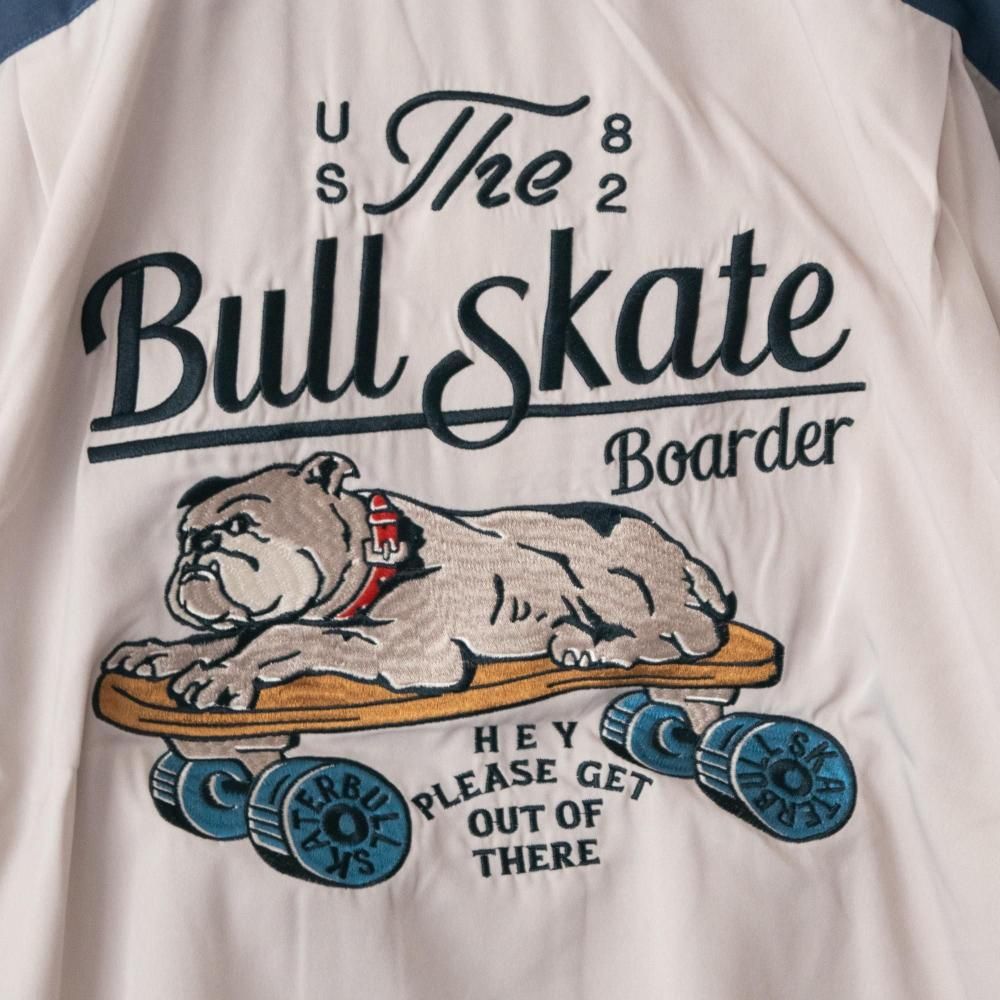 スケボーに乗ったブルドッグ刺繍!さらっと羽織れるオープンカラーシャツ
