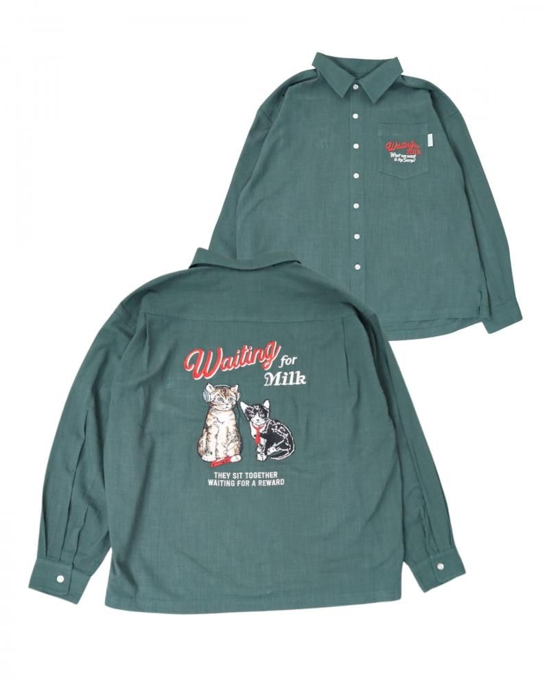 さらっとした麻ライクな生地のシャツに待ち時間を楽しんでいる猫たちの刺繍をON