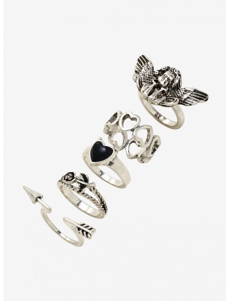 恋する気持ちを指先にまとえるリングセット。エンジェル、ブラックハート、ローズ、アロー、カットアウトハートの5種類がセットになっています。