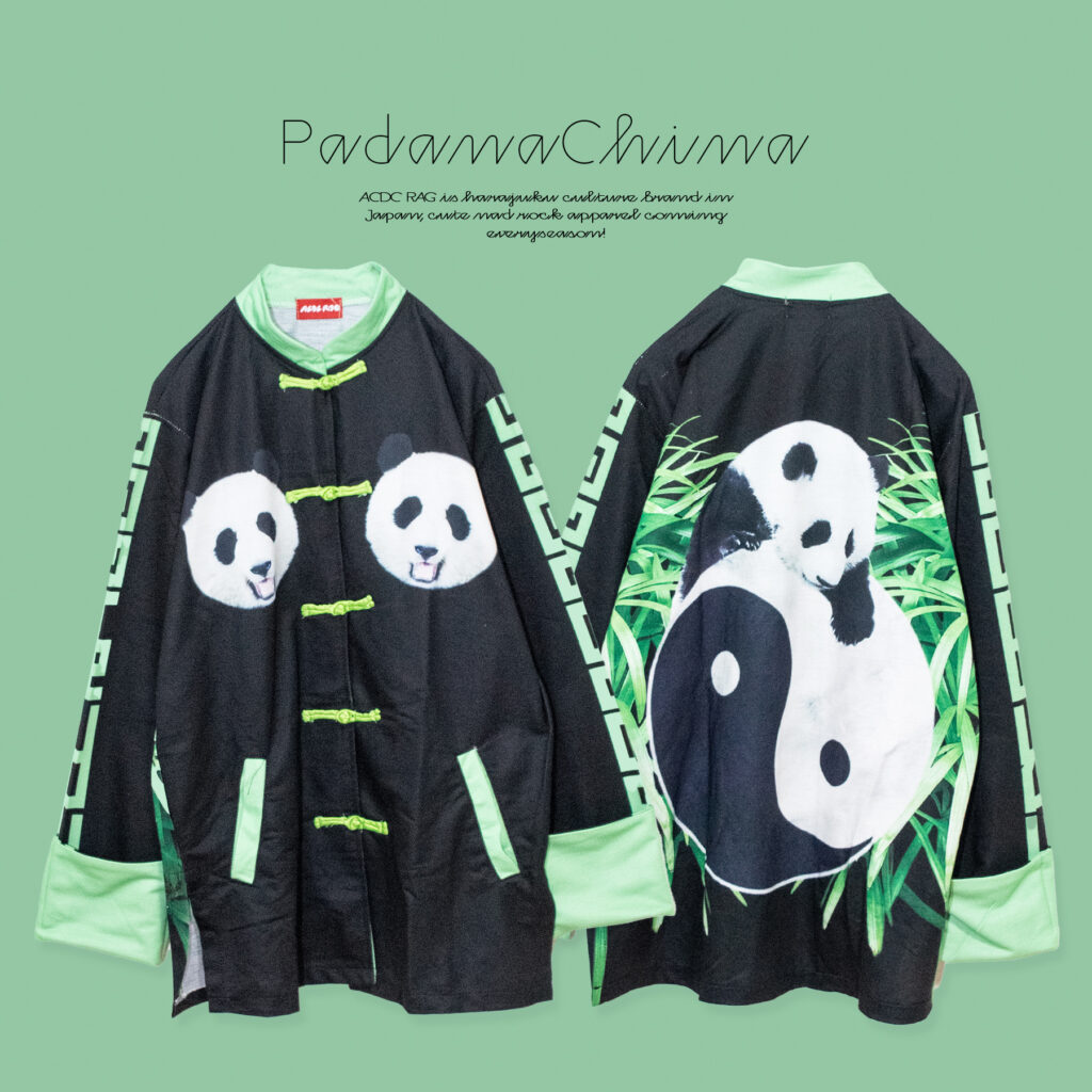 蛍光グリーンのコントラストと、パンダのインパクトが一度見たら忘れられない~🐼✨超絶キュートなチャイナシルエットのジャケットで、背中に大きな陰陽マークが映えまくっています👏他とは絶対に被りたくない、個性派なあなたにおすすめです!